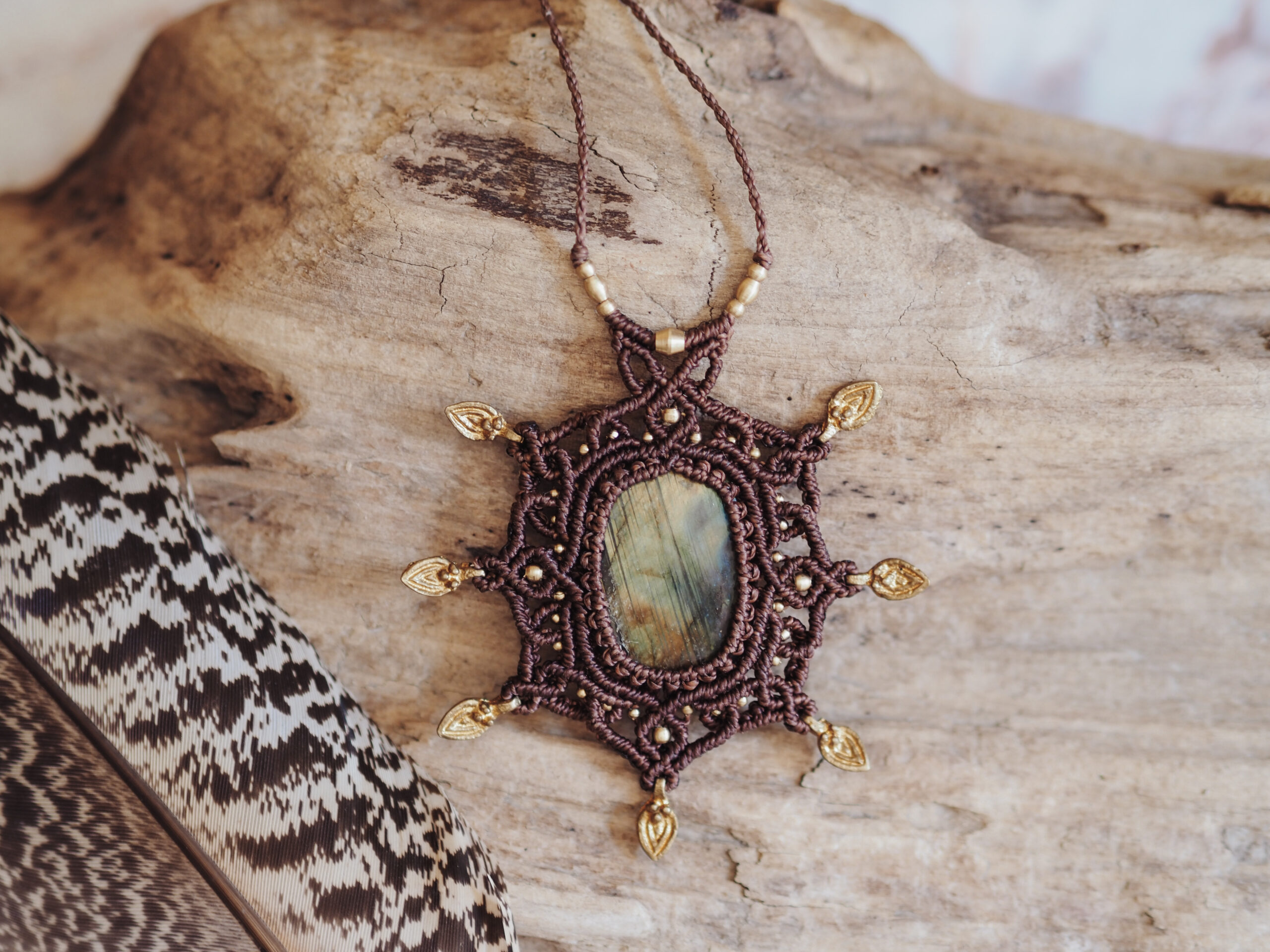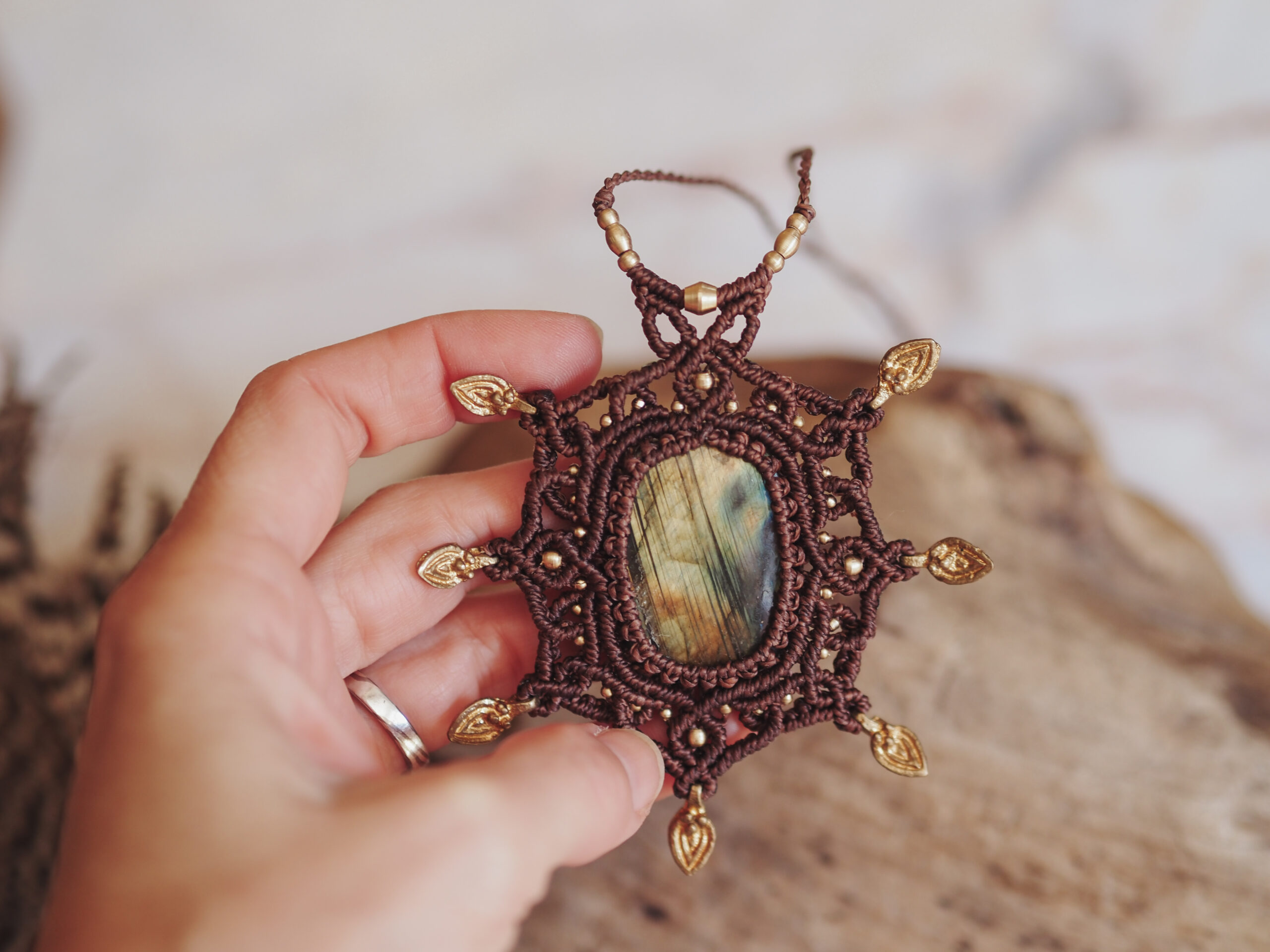 Połączenie cynamonowego splotu i labradorytu o złocistej poświacie tworzy harmonijny, głęboko kojący amulet. Wzór mandali symbolizuje powrót do centrum – do siebie.