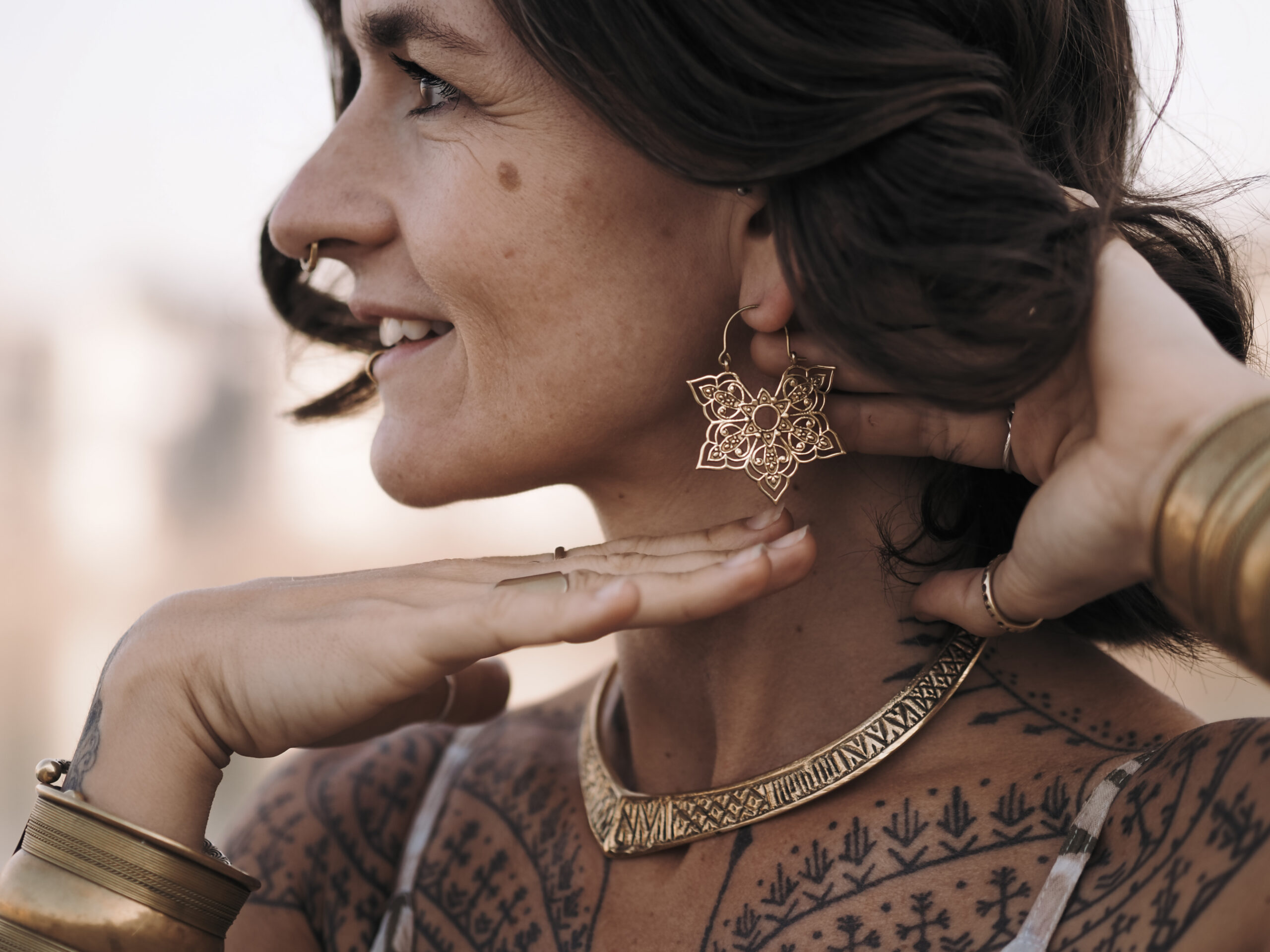 Etniczne kolczyki w kształcie mandlakowych gwiazd.