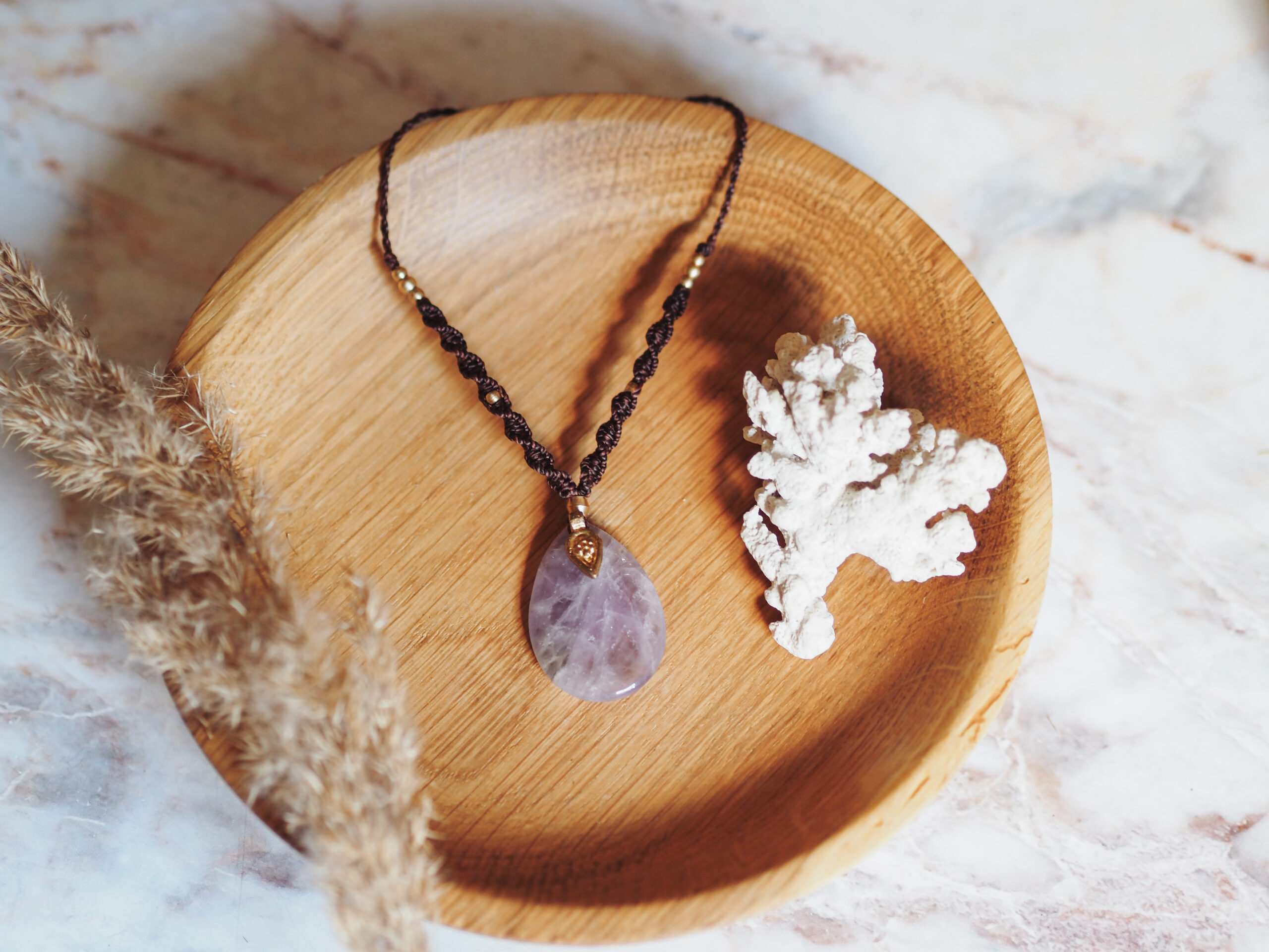 Prosty i wyrazisty – ametyst w kształcie łezki, opleciony ręcznie na ciemnoczekoladowym sznurku, ozdobiony subtelną mosiężną zawieszką. Kamień znany z działania uspokajającego i wspierającego intuicję.