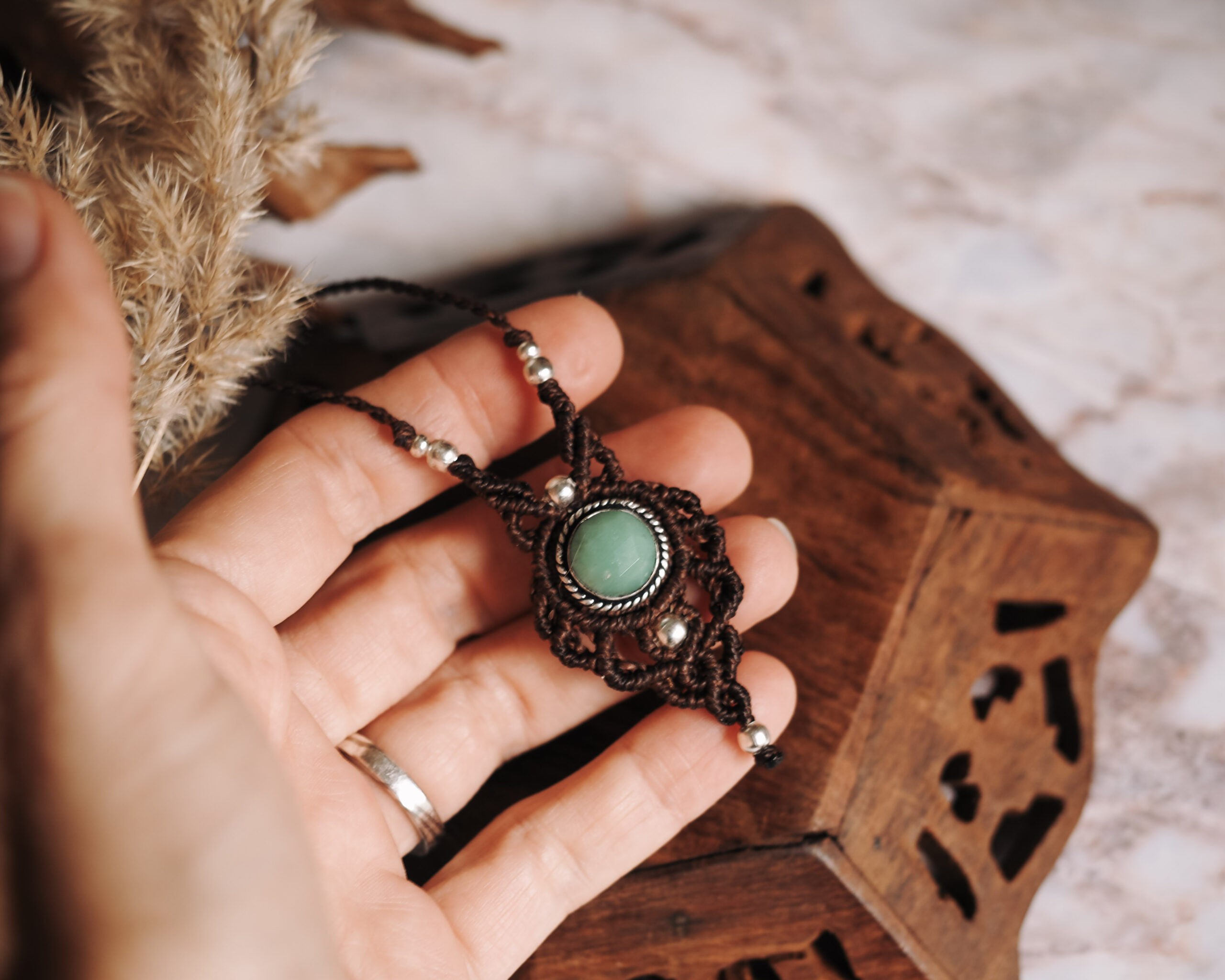 Delikatny, okrągły jadeit w odcieniu jasnej zieleni oplata subtelna sieć mikro makramy — lekka jak oddech, który uspokaja serce.