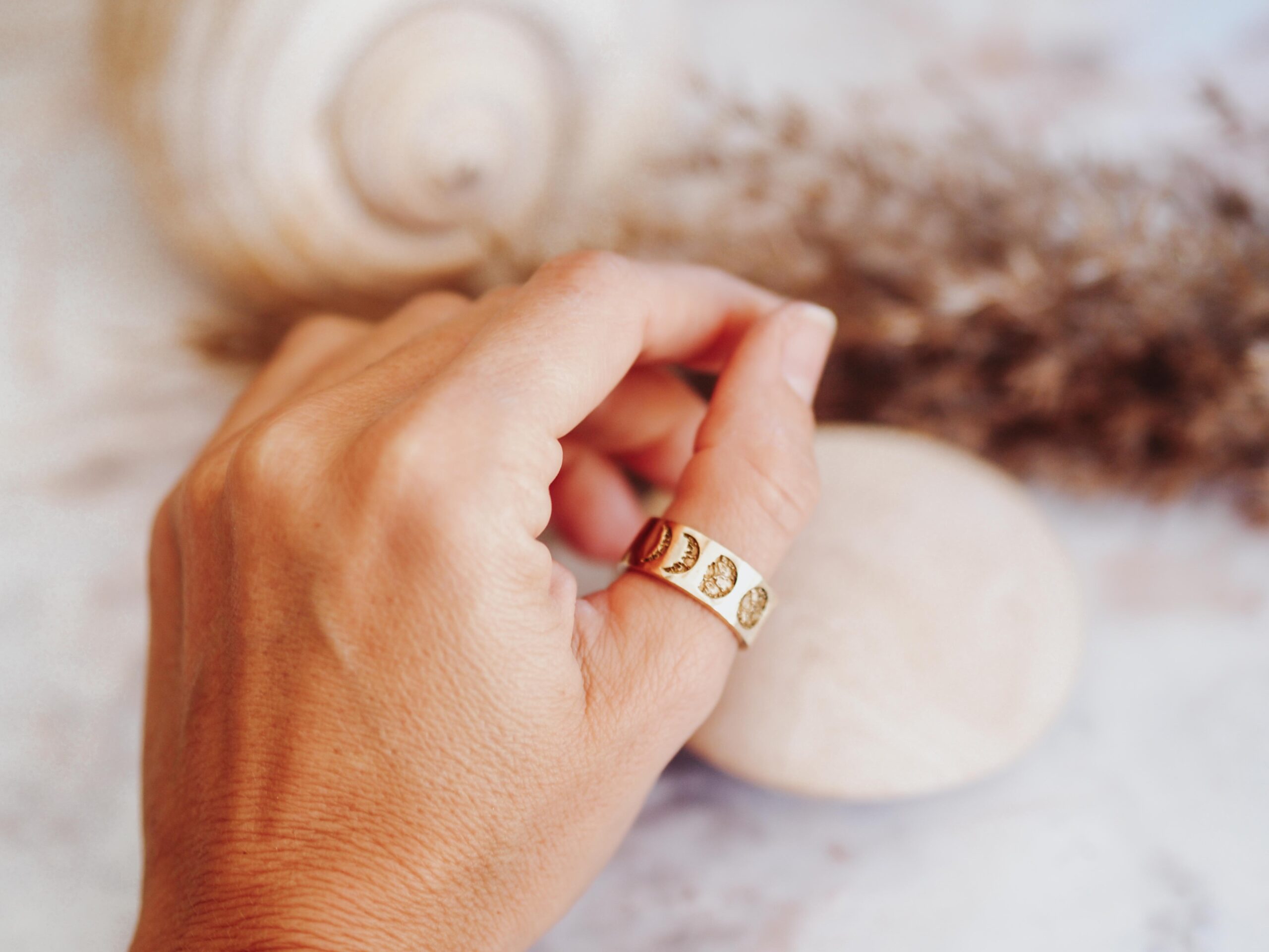 Obrączka z motywem faz księżyca. Wykonany z mosiądzu. Rozmiar jest regulowany do większości rozmiarów (min. rozmiar to ok. 7 US, otwarta obrączka pozwala na powiększenie rozmiaru). Daj mi znać w polu PERSONALIZACJA, jaki rozmiar nosisz, tak abym mogła dopasować pierścionek do Twoich potrzeb.